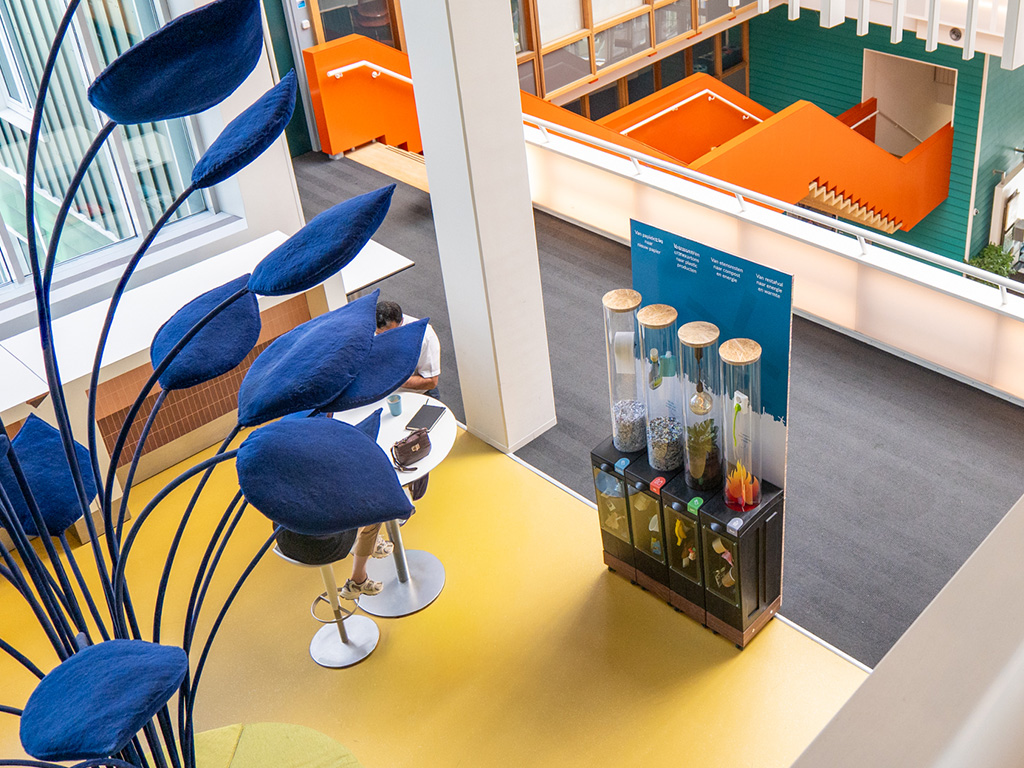 Maar afval reduceren stopt niet bij het neerzetten van de circulaire afvalmodules voor onder andere plastic, gft, papier. “De bakken neerzetten is stap één, maar dan ben je er nog niet,” vervolgt Tanja. “De grootste uitdaging zit bij de gebruiker: het afval moet natuurlijk wel in de juiste bak belanden.” GP Groot kwam, samen met dochteronderneming Circulair in Bedrijf, met een aantal ideeën om draagvlak te creëren voor het bewust omgaan met afval. Sascha vertelt over één van de initiatieven: “We hebben een showcase geplaatst waarin je kunt zien wat er met afval gebeurt: bijvoorbeeld papiersnippers met daarboven de producten die ervan gemaakt worden. Dat maakt het tastbaar en mensen worden er enthousiast van. Storytelling helpt enorm. Extra leuk aan deze showcase is dat hij is gemaakt van niet meer bruikbare Bontons. Zo geven we ook die een tweede leven. ”