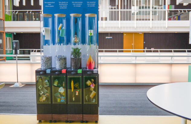 Maar afval reduceren stopt niet bij het neerzetten van de circulaire afvalmodules voor onder andere plastic, gft, papier. “De bakken neerzetten is stap één, maar dan ben je er nog niet,” vervolgt Tanja. “De grootste uitdaging zit bij de gebruiker: het afval moet natuurlijk wel in de juiste bak belanden.” GP Groot kwam, samen met dochteronderneming Circulair in Bedrijf, met een aantal ideeën om draagvlak te creëren voor het bewust omgaan met afval. Sascha vertelt over één van de initiatieven: “We hebben een showcase geplaatst waarin je kunt zien wat er met afval gebeurt: bijvoorbeeld papiersnippers met daarboven de producten die ervan gemaakt worden. Dat maakt het tastbaar en mensen worden er enthousiast van. Storytelling helpt enorm. Extra leuk aan deze showcase is dat hij is gemaakt van niet meer bruikbare Bontons. Zo geven we ook die een tweede leven. ”