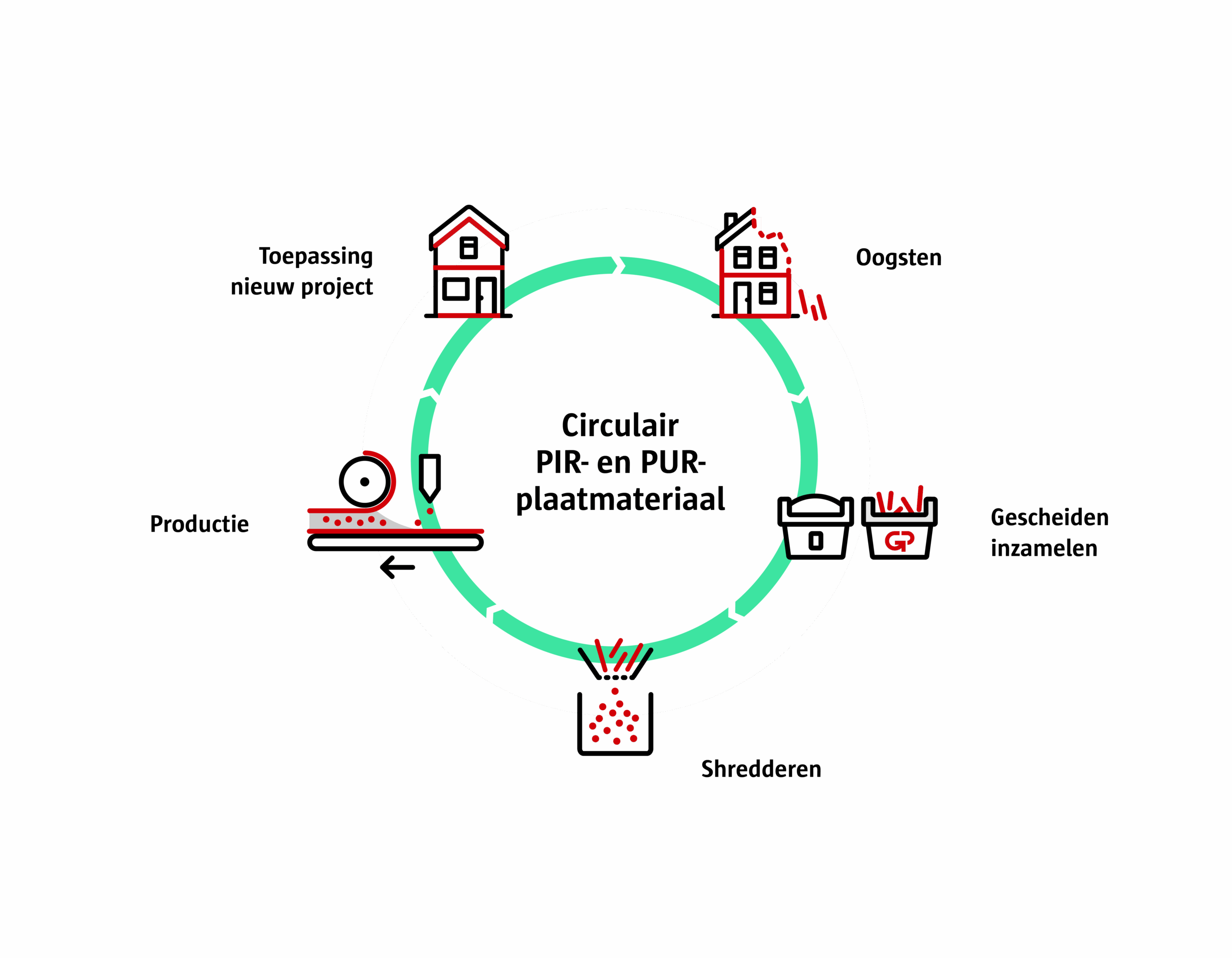 - Het PIR- en PUR-schuim wordt deels omgezet naar een vloeistof en van deze vloeistof en het gas maken ze weer nieuwe PIR en PUR.